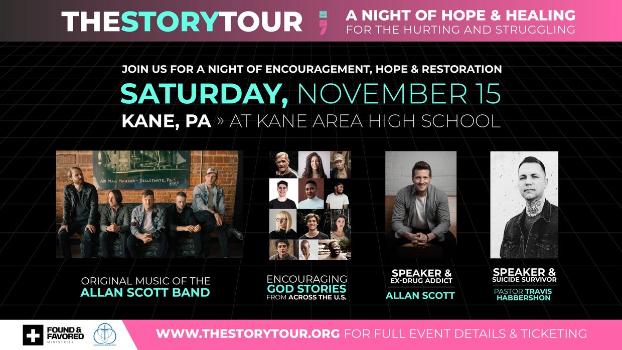 Join us for 'The Story Tour', a one-night musical journey of faith, featuring the hope-filled music of Allan Scott Band, inspiring times of ministry with speakers Allan Scott and suicide survivor Pastor Travis Habbershon, powerful testimonies and stories of God’s redemption. Stories of freedom from guilt, shame, depression and addiction. Stories of amazing healings and restored marriages. All designed to communicate one truth:
