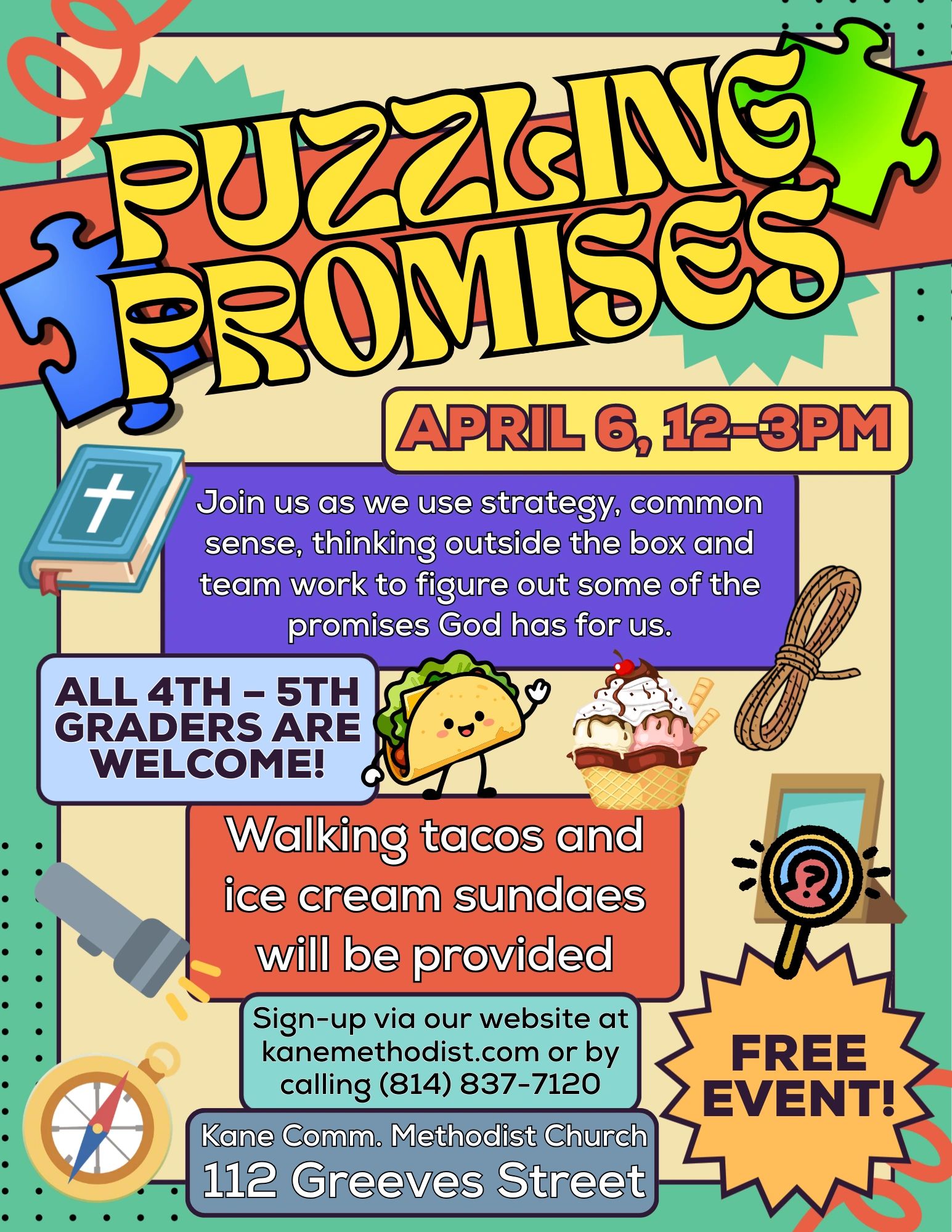 Monday, April 6, 12-3p, at Kane Community Church. PUZZLING PROMISES is the theme of the day. We will be using strategy, common sense, thinking outside of the box and team work to figure out what some of God’s promises are. Walking tacos and ice cream sundaes will be involved. All 4th & 5th graders invited no matter which church you belong to or even if you don’t attend church. There is no cost for this, we would appreciate you signing up so we can make sure we have enough equipment for everyone.